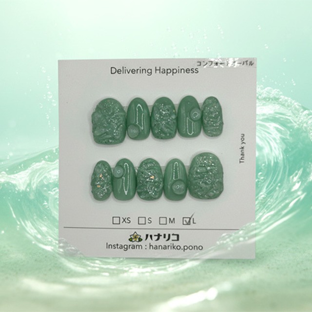 深みのあるフォレストグリーンをベースに、 まるで雫や苔、森の中の小さな世界を閉じ込めたような立体感のあるデザイン。 透明感のあるグリーンの中に、 繊細なラメやぷっくりとした質感を重ねることで、 奥行きと自然なきらめきを感じられる仕上がりになっています。 ナチュラルでありながら存在感があり、 指先にそっと個性を添えてくれるネイルチップ。 落ち着いた色味が、大人のスタイルにもよくなじみます。 ★ デザインの特徴 ・フォレストグリーンの落ち着いたカラー ・水滴のような立体感のあるニュアンスアート ・ラメが控えめにきらめく奥行きデザイン ・指にフィットしやすいコンフォートオーバル形状 ★ サイズ(コンフォートオーバル) Lサイズ 親指0 / 人差し指5 / 中指4 / 薬指5 / 小指7 ※測り方は最後のページに掲載しておりますので、そちらをご参照ください。 ★ おすすめのシーン ・自然やアースカラーが好きな方に ・落ち着いたトーンでまとめたい日 ・大人カジュアルやシンプルコーデのアクセントに ・個性のあるネイルを楽しみたいとき ★お届け内容 ・ネイルチップ 10本(両手分) ・粘着グミ 1回分(お試し用) ・ミニ爪やすり 1枚 ・ウッドスティック 1本 ■ご確認事項 ・ハンドメイド品のため、色味やパーツの配置に個体差がございます ・微細な気泡や凹凸が見られる場合がございます ・モニター環境により実際の色味と異なる場合があります ========================== ハナリコワークスについて Hanarico Works(ハナリコワークス)は、 一人ひとりの想いを大切にしながら、 「手づくりの温もり」と「やさしい彩り」を届ける就労継続支援B型事業所です。 利用者さんたちが、時間をかけて丁寧に仕上げたネイルチップ。 それぞれの個性や気持ちが、色や筆のひとつひとつに込められています。 私たちは、“手のひらから笑顔がつながっていく” そんな未来を描きながら、日々ものづくりを続けています。 ========================== #ハナリコワークス #HanaricoWorks #ネイルチップ #コンフォートオーバル #就労継続支援B型 #ハンドメイドネイル #指先から元気を
