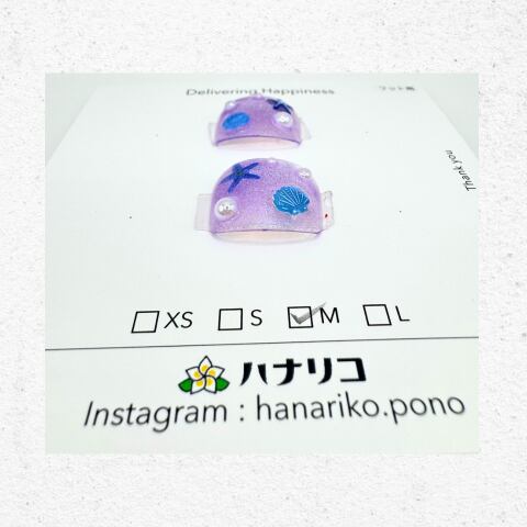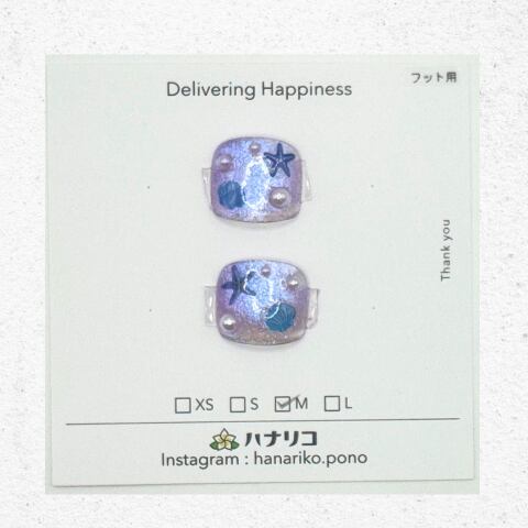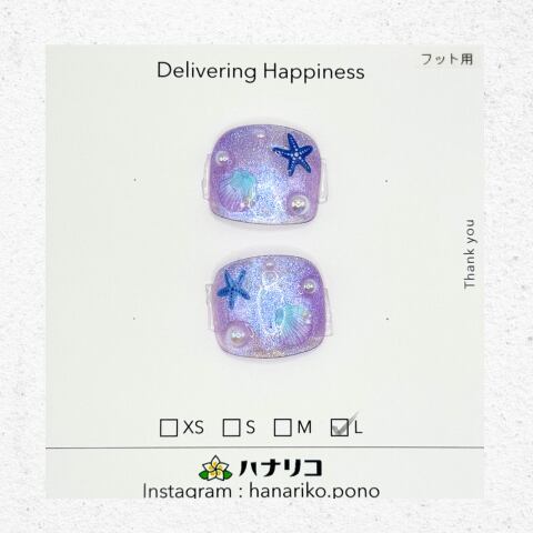 やわらかなパープルの輝きに、ヒトデや貝殻モチーフを散りばめた、幻想的な海の世界を感じるフットネイル。