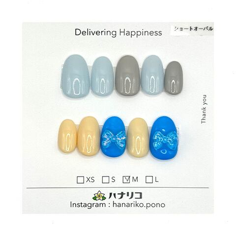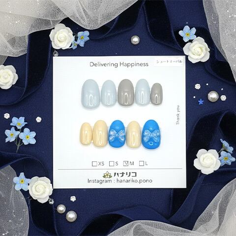 ポイントのブルーネイルには、立体感のあるリボンモチーフをあしらい、