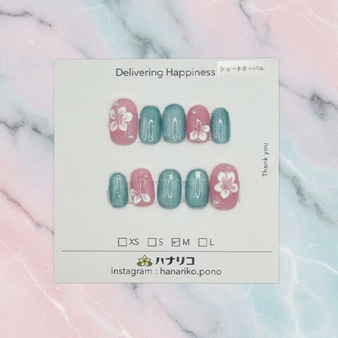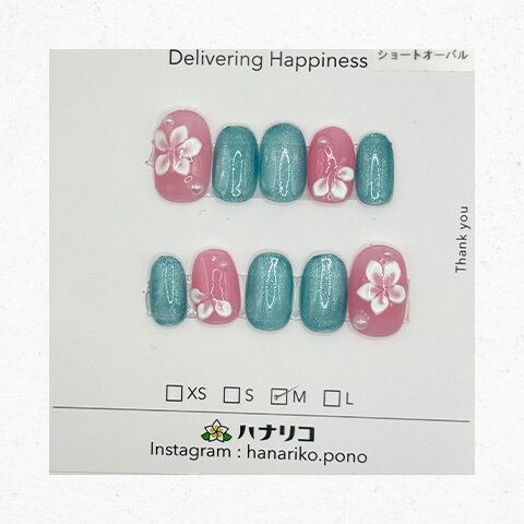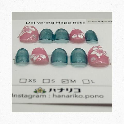 【T-35.36】ピンクブルーラメ白フラワー ショートオーバル S・Mサイズ