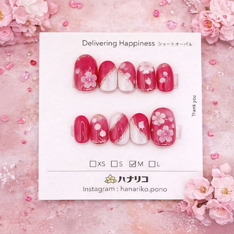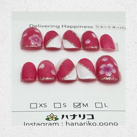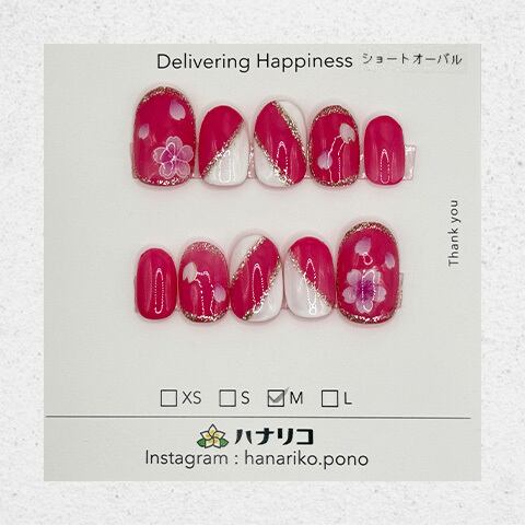 鮮やかなピンクとホワイトを組み合わせ、ゴールドラインとフラワーモチーフをあしらった華やかなデザイン。