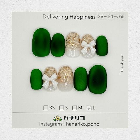深みのあるグリーンと、きらめくゴールドラメを重ねたホワイトを組み合わせた、華やかさと落ち着きを併せ持つデザイン。