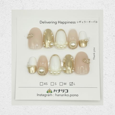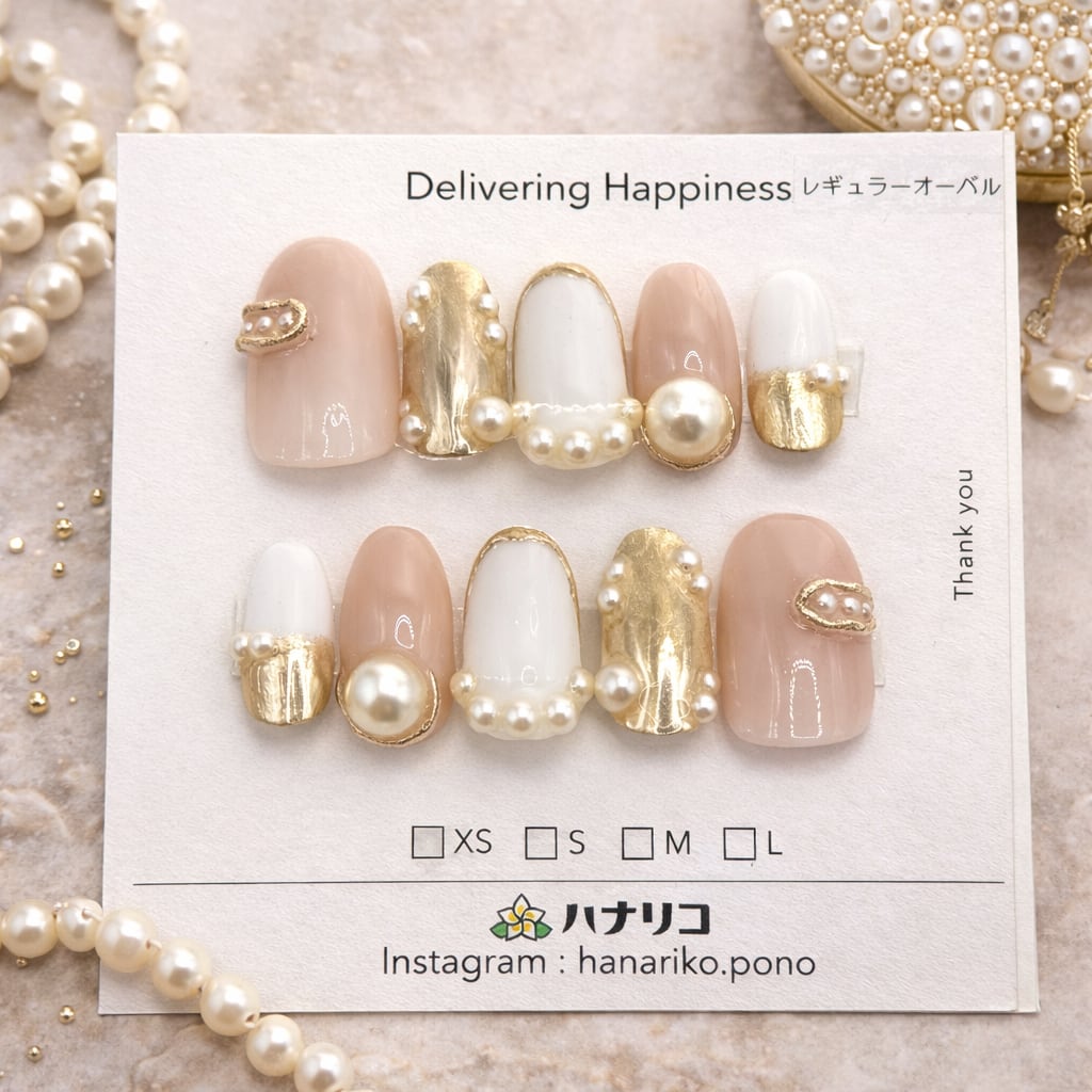 パールと立体ゴールドが指先を華やかに彩る、上質な仕上がりです。