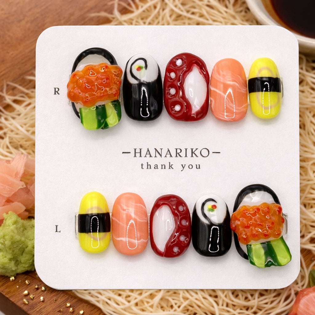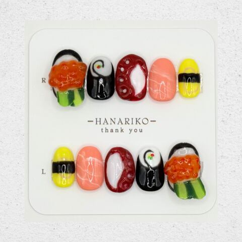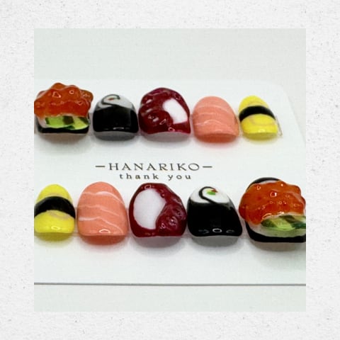 お寿司モチーフを立体的に表現した、遊び心たっぷりのユニークネイル。